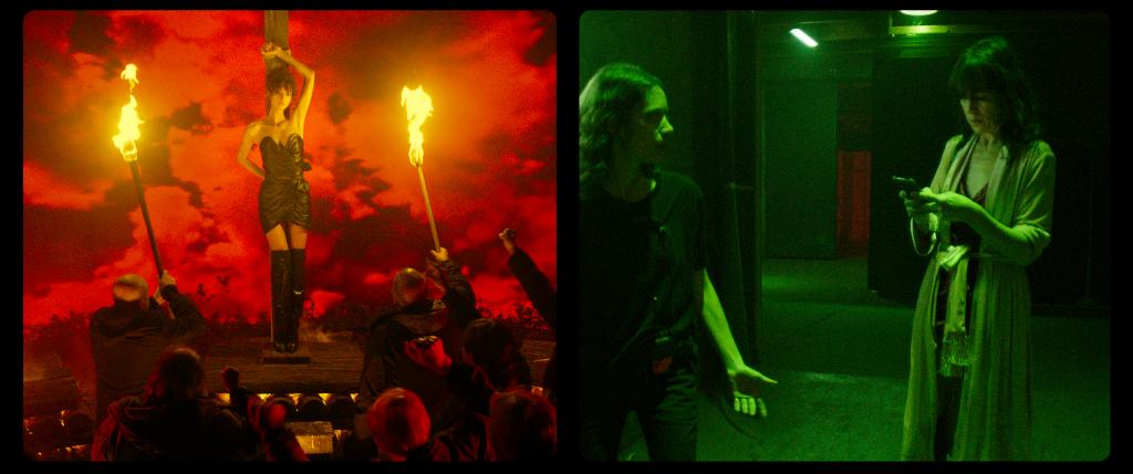 Mais plus que l’écho acide à son propre média, la chasse aux sorcières de Lux Aeterna cache surtout derrière elle une ode aux femmes, au respect qui leur est dû, ainsi qu’à la place centrale qu’on doit leur (re)donner dans le monde du cinéma. Dépossédées in fine de leur libre-arbitre et de leur vision, par des hommes aveuglés par leur égo et leur stature – au même titre que Françoise Lebrun dans Vortex se voit privée de sa capacité de choix (dans une allusion à peine voilée à la question sensible de l’euthanasie) et de son autonomie (à cause de la maladie d’Alzheimer qui la ronge, certes, mais aussi à cause de son égocentrique de mari) -, c’est aussi leur dignité devant et derrière la caméra qui est en jeu dans Lux Aeterna. Deux axes de représentation à nouveau soulignés par cette fameuse scission de l’écran, deux cadres sous formes de vignettes Instagram sans glamour, dans lesquelles chacune des comédiennes va évoluer, à la fois de manière parallèle et totalement intriquée. Deux ouvertures sur un plateau de tournage peu à peu gagné par une hystérie irrationnelle, où leurs statuts respectifs (réalisatrice du film, et actrice principale), pourtant intrinsèquement porteurs d’une certaine autorité, vont peu à peu être piétinés, balayés sans autre forme de procès… envoyées, donc, au bûcher des vanités. Deux chemins différents, faits de promesses envolées, pour une même finalité : Lux Aeterna et Vortex, ou les deux faces d’une même pièce emprunte d’inéluctabilité.